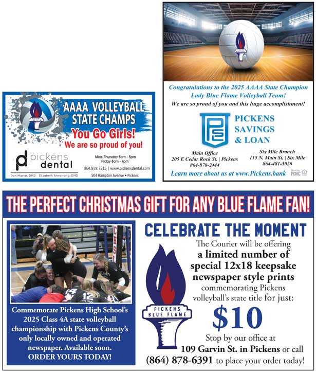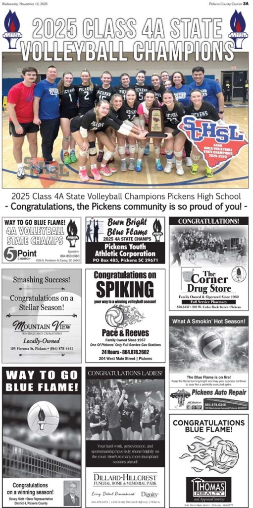 The Bishops, the national leader in volleyball state championships according to the South Carolina High School League, failed to provide much of a challenge for Pickens as the Blue Flame swept the Bishops 3-0 in straight sets to secure Pickens’ 18th volleyball state championship in school history.