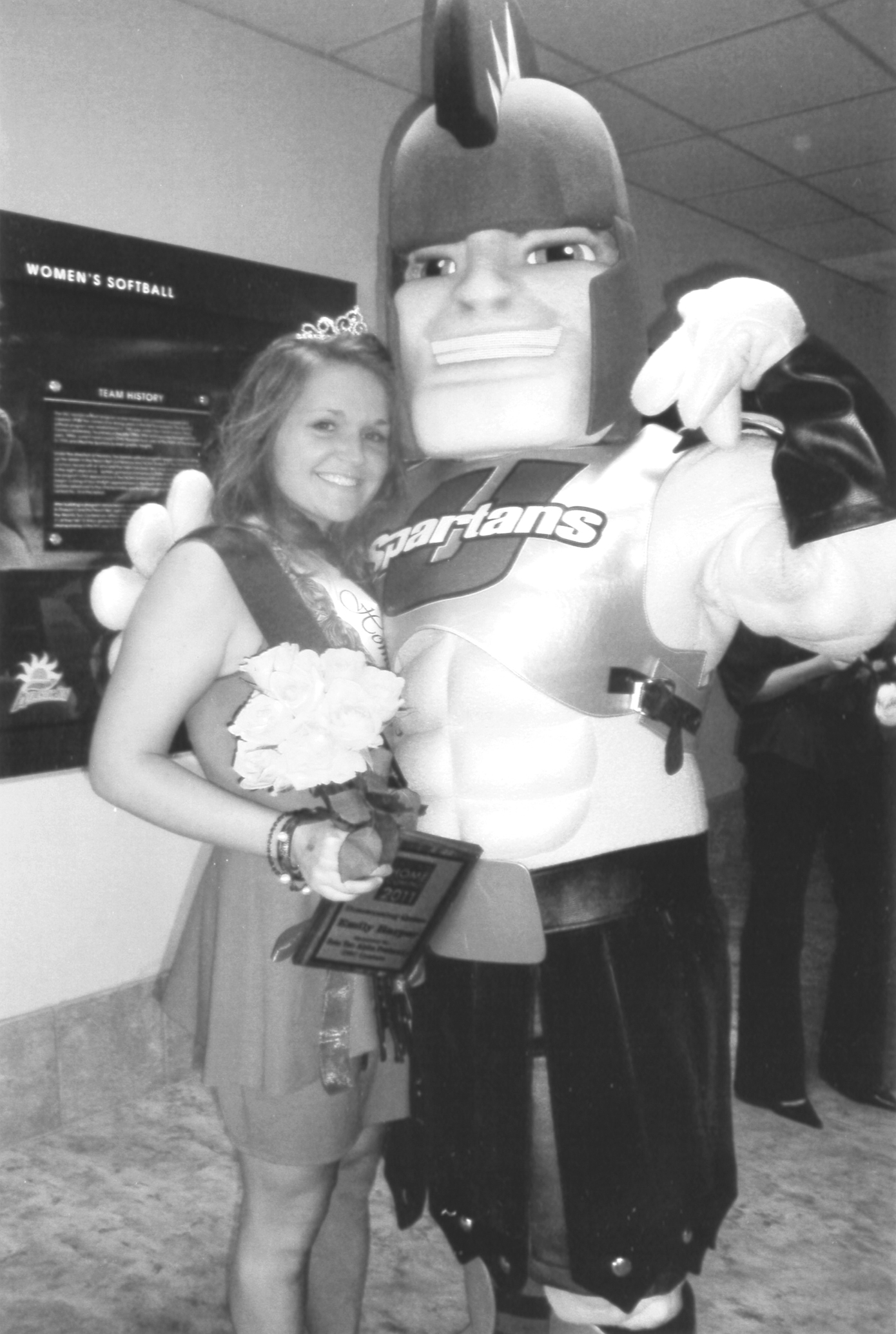 Emily Suzanne Harper, representing Zeta Tau Alpha, was recently elected 2011 Homecoming Queen at USC-Upstate in Spartanburg, where she is a senior majoring in Exercise Science with a minor in Biology. The USC-Upstate Spartans basketball game was the venue for homecoming festivities. Emily is the daughter of Mr. and Mrs. David Harper of Pickens. Above, she is pictured with the Spartans mascot.