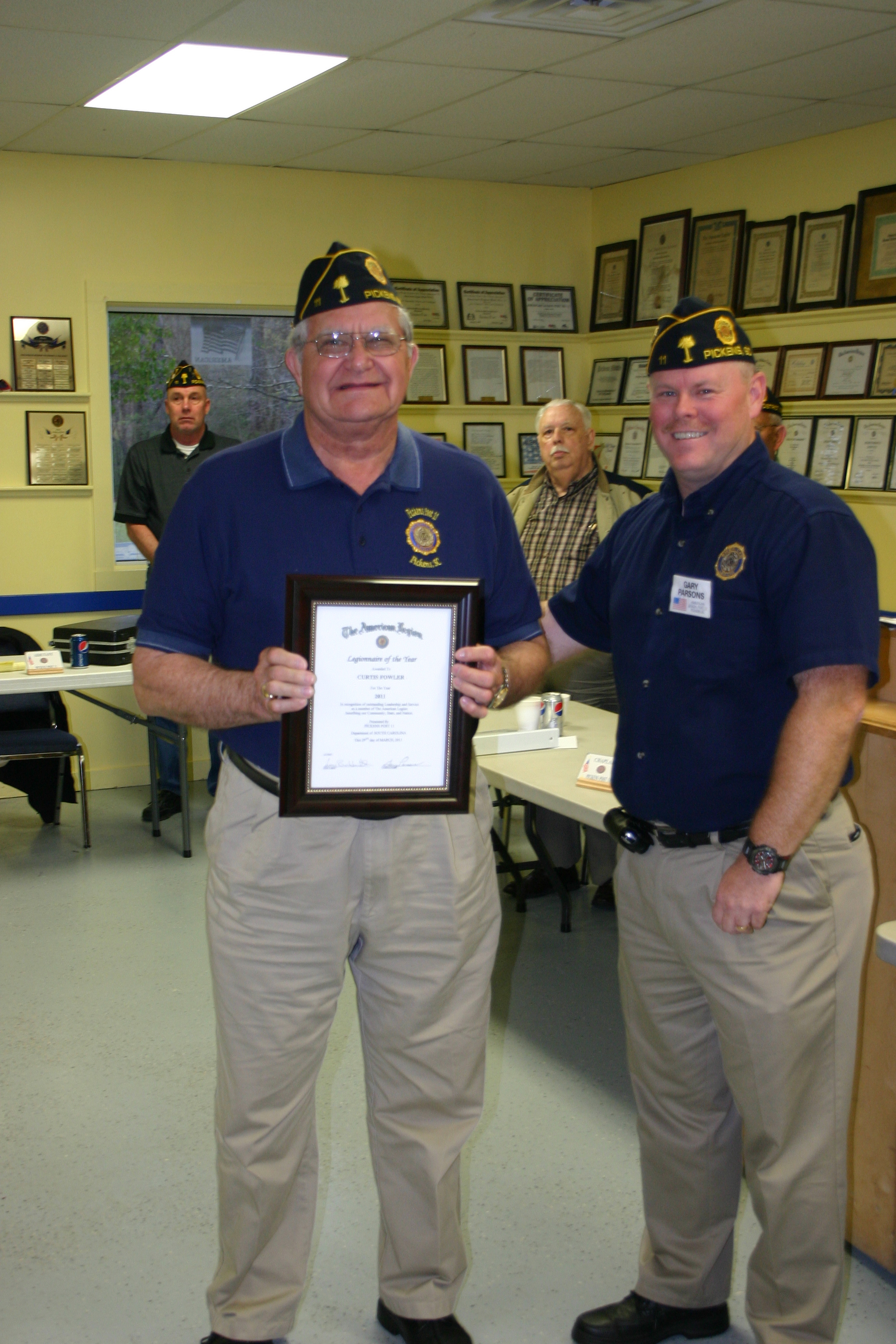 Curtis Fowler, left, was honored as Pickens American Legion Post 11’s Legionnaire of the Year last Tuesday night. Fowler, who received his award from Post Commander Gary Parsons, right, was honored in part because of his dedication to visiting local veterans in rest homes around the Upstate area, Parsons said.