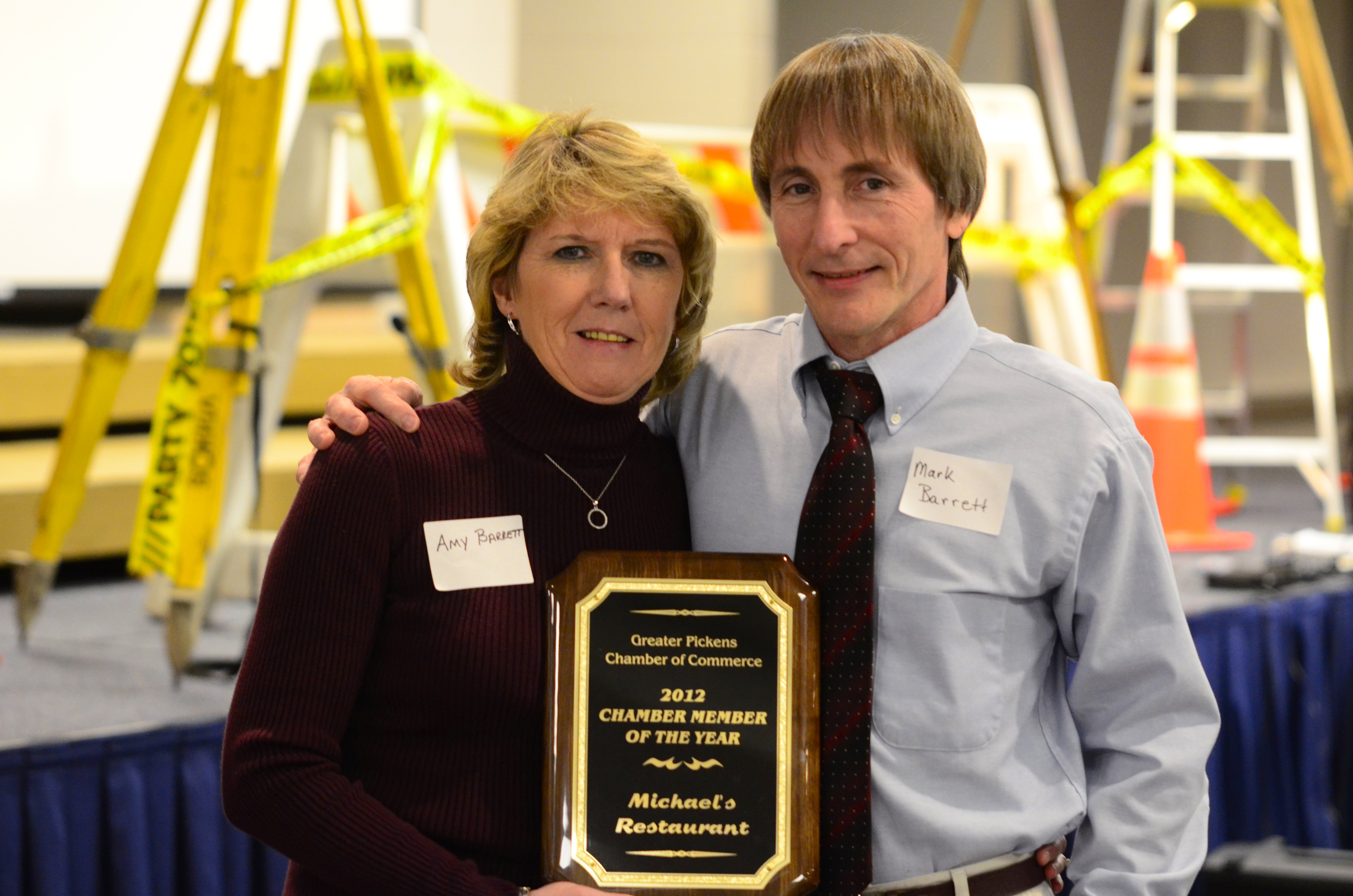 The Pickens Chamber of Commerce held its annual banquet last Saturday at Pickens First Baptist Church Fellowship Hall, featuring guest speaker Jane Jenkins Herlong. Dr. Jim Mahanes, left, was honored as the Citizen of the Year at the banquet, while Amy and Mark Barrett, below, received recognition for Michael’s Restaurant, the 2012 Chamber Member of the Year.