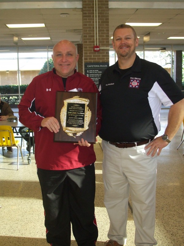 Frankie Robinson of Pickens, left, recently received the Danny Jones Volunteer Award for 2012 from Paul McCulloch, South Carolina Dixie Youth State Director. Robinson was awarded at the state meeting in Irmo on Jan. 16. The award is given once a year annually, and nominations are taken from any franchised dixie youth program in the state.