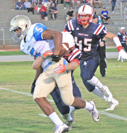 The first two Red Devil drives of the game started deep in their own territory. They started at their own 19-yard line on their first drive and their own 10-yard line on the second drive of the game. Following a 15-yard punt by Hughey on the Red Devils’ second drive, the Patriots took only two plays to score as Bufford ran for 20 yards on the first play of the series and then scored from one yard out for a 7-0 lead.