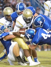 A swarm of Pickens defenders take down a Pendleton runner during the Bulldogs’ 26-16 win in the Blue Flame’s home opener on Friday night.