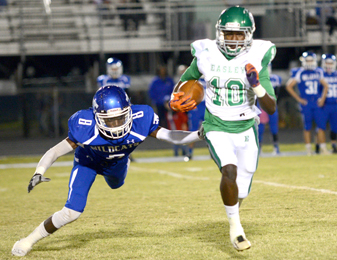 On Woodmont’s first fourth-quarter possession, Green Wave defenders Ethan Meyers and Sean-Thomas Faulkner stuffed Deonte Luster for a loss of two on a fourth-down attempt from the Easley 13-yard line.