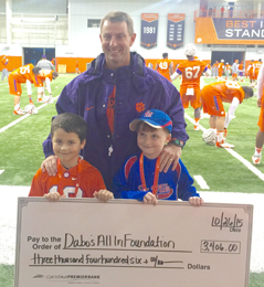 On Tuesday, Oct. 20,[cointent_lockedcontent] the Six Mile Braves and Cubs 8-and-under fall baseball teams played a coaches pitch game at Ponderosa Park to raise money for breast cancer awareness. The Six Miles Cubs were coached by Rusty Elrod, and the Six Mile Braves were coached by Sam Elliott. The teams, along with their coaches and the community, raised $3,406 for Clemson football coach Dabo Swinney’s “All In Foundation” for breast cancer awareness. Swinney is pictured being presented the check by Gavin Elrod and Brody Elliott.[/cointent_lockedcontent]