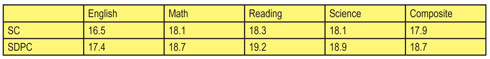 SDPC students earned an average composite score of 18.7, higher than the state average of 17.9. They earned composite scores of 17.4 in English, 18.7 in math, 19.2 in reading and 18.9 in science. By comparison, students across the state averaged 16.5 in English, 18.1 in math, 18.3 in reading and 18.1 in science.