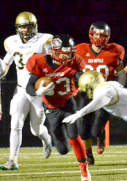 The Red Devils finally found their rhythm late in the fourth quarter and put together a drive of 90 yards in only four plays to cut the Pendleton lead in half at 14-7. Tyler Renaud scored from four yards out to cap the drive. Hughey had two huge runs for 18 yards and 53 yards to set up the score. It appeared Hughey scored on the long run, but it was ruled he stepped out of bounds at the Bulldog 4-yard line.