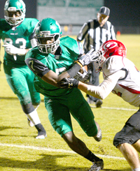 Easley’s Will Drawdy plows through Greenville defenders during the Green Wave’s win over the Red Raiders on Friday night.