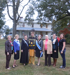 Pickens’ Hopewell, part of Clemson University. The ceremony opened with a flag procession by the Clemson University Army ROTC and the D. W. Daniel High School AFJROTC presenting the colors. Will Hiott, director of historic properties, gave the welcome, and Chief Gene Norris of the PAIA Lower Eastern Cherokee Nation of South Carolina gave the Cherokee response. Dr. Dave LaVere spoke as a French fur trader who had lived with the Cherokee in the 1780s, and Dr. Jerry Reel gave a program on “Mr. Pickens.” Senator Thomas Alexander was a special guest. Pictured, from left, are SCDAR state corresponding secretary Harriet Nash, NSDAR vice president general Dot Lind, SCDAR state regent Dianne Culbertson, Chief Gene Norris, NSDAR chaplain general Ann Crider, Lucy Willis, SCDAR state recording secretary Mari Noorai and Skyagunsta Society CAR president Anna Haskins.