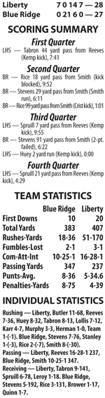 Liberty was right back in business when Jacob Herman recovered a Sonny Stevens fumble at the Blue Ridge 31-yard line. The Red Devils got as close as the Tiger 6-yard line after passes of 15 yards to Michael Spruill and 18 yards to Colton Leroy with a holding call in-between, but Blue Ridge blocked a 27-yard Austin Kemp field goal attempt to end the drive.
