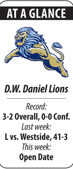 The Lions started out with momentum on their side. Daniel got the ball first and moved the ball 17 yards in six plays. An illegal procedure call slowed the drive and forced a punt, but Westside’s Eb Jones could not hang on to the kick, fumbling the ball away, with Daniel’s Tyler Venables recovering for the Lions at the Westside 14.