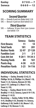It did show on the overall stats for the game. The Red Devils held the advantage in total yards 265-199. The Patriots led the ground game 165-111, while the Red Devils held the advantage in the passing game 154-34. Huey led the Red Devils with 109 yards through the air, as he was 5-of-9 passing with one interception.