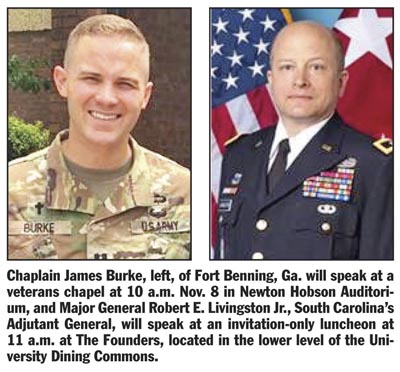 At 10 a.m., the public is invited to a chapel honoring our veterans and currently serving military personnel in the auditorium of Newton Hobson Chapel and Fine Arts Center, 737 Wesleyan Drive, with Army Chaplain, Captain James Burke from Fort Benning, Ga., as the speaker.