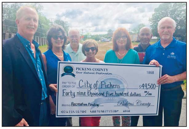 Pickens County councilman Wes Hendricks presented a check from county recreation funds to Pickens mayor David Owens and members of city council to help with funding for a park at the city’s Doodle Trail trailhead. Pictured, from left, are Hendricks, Patti Welborn, Donnie McKinney, Donna Owen, Lois Porter, Fletcher Perry and Owens. Courtesy photo