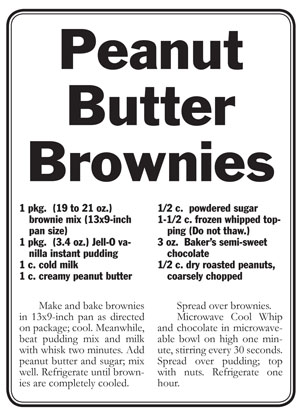I never bothered making brownies from scratch because this was one package mix that really was “just like homemade.” So now what am I supposed to do? I’ve tried all the other mixes and don’t like any of them. I guess it’s time to go back to basics and make them from scratch. This week, four brownie recipes are featured as alternates to Martha White. One of the recipes, peanut butter brownies, uses mixes.
