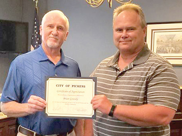 water/wastewater superintendent Brian Gravely last week. Gravely has been a dedicated and vital member of the Pickens team, helping keep the community’s clean water flowing for two decades. “We are blessed to have him,” Owens said. “Thank you, Brian.”