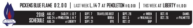 PENDLETON — After a hard-fought slugfest with defense the name of the game last Friday night at Pendleton, the Pickens Blue Flame are still looking for their first victory of the 2018 season after falling to the