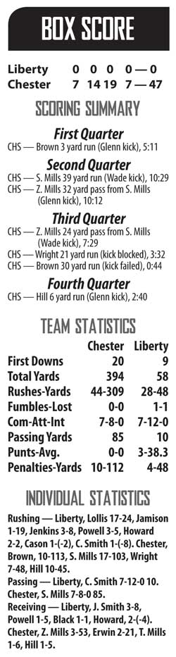 CHESTER — Led by a stifling defense, the undefeated Chester Cyclones rolled over Liberty in the two teams’ Class 3A playoff opener on Friday