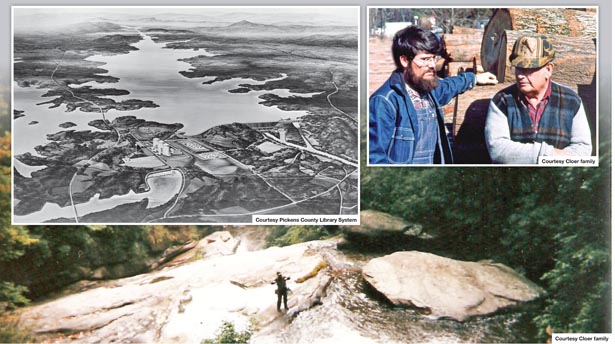 Top right: Tom Cloer and his father, Carl T. Cloer Sr., speak at the Pickens sawmill, which was built “to accommodate the treasures of timber to be removed for the gargantuan Keowee-Toxaway Project,” according to the author.