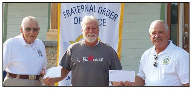 Fraternal Order of Police Foothills Lodge No. 9 treasurer R.A. Gibson, left, and president J.B. Kelley recently presented the Rev. Rob McElea with Life House Children’s Project in Dacusville with two checks. Gibson presented McElea a check for $500 as a memorial tribute for Deputy Mike Doty of York County. Doty was killed in the line of duty in 2018. Kelley presented a second check in the amount of $2,000 from the Lodge to help complete the home’s needs.