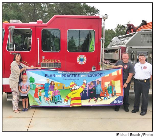 Easley State Farm agent Meg Boyles recently donated fire prevention kits to the Crosswell Fire District ahead of the National Fire Protection Association Fire Prevention Week. The kits contain educational fire prevention materials for homeowners and children. Firefighters can share the information at fire stations or at community events. Fire Prevention Week is Oct. 6-12. For more information about fire prevention or fire prevention week, visit nfpa.org/fpw. Pictured are Boyles, her granddaughter, Kiya Salley, Lt. Brad Wilson and Chief Billy Gibson.