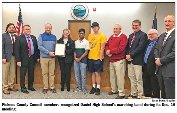 PICKENS — County officials commended Daniel High School’s marching band for bringing home a championship.