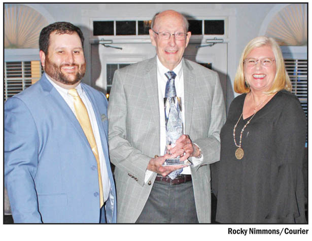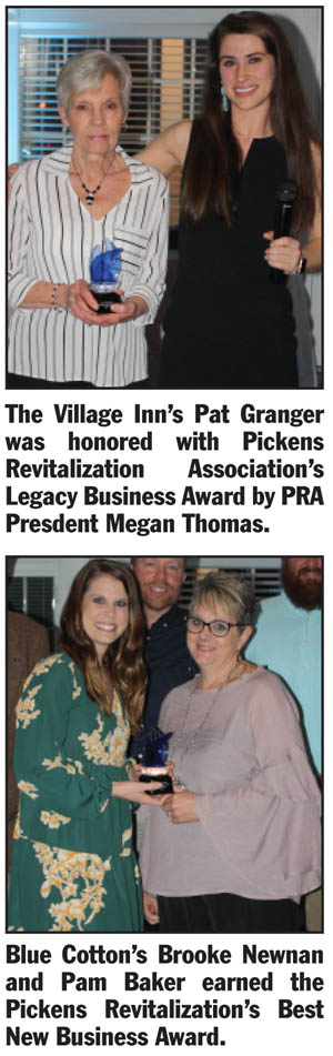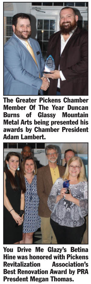 The Greater Pickens Chamber of Commerce and Pickens Revitalization Association held their annual awards banquets on Friday. With hand sanitizer available all around, chamber members got a chance to rub elbows and enjoy a great meal prior to the cancellation of many events around the county in the coming days. Above, longtime Pickens attorney Ken Acker was honored with Duke Energy’s Citizenship Award during the event. Acker is flanked by Pickens Chamber President Adam Lambert and Duke Energy community relations manager Emily DeRoberts.