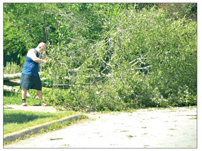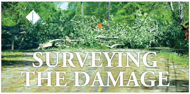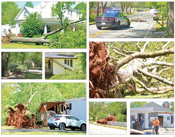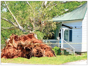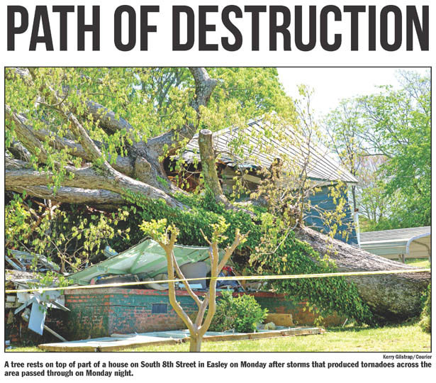 overnight storms. Two tornadoes touched down in Pickens County, and high winds and heavy rain caused even more widespread damage. Although there were no deaths in the county, several people were injured, thousands found themselves without power, and many residents were forced to spend the day dealing with insurance companies, downed trees and limbs and storm cleanup. Photos by Kerry Gilstrap/Courier