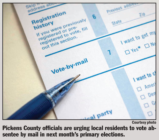 PICKENS — Every voter in South Carolina can vote absentee in the June primaries and any necessary runoffs, and officials are urging residents to stay at home and vote by mail.