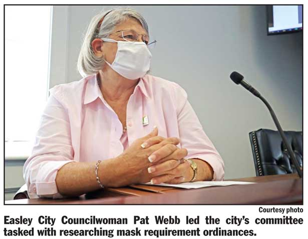 Councilwoman Pat Webb led the committee that researched mask requirement ordinances. She reviewed the committee’s discussion during a city council work session held before city council’s regular meeting Monday night.