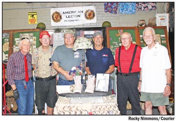 Junior Shove, owner of Pickens’ new military museum, Fort Dix Army Navy Supply Store, located in the Market at the Mill in Pickens, was honored by members of the American Legion Post 11 and creative artist Nathan Lipscomb with a donation of a Battlefield Cross made by Lipscomb. The Battlefield Cross was how many soldiers were honored on the battlefield following their ultimate sacrifice and has beem common since the time of the Civil War. The cross is made from the serviceman’s weapon, helmet and boots. The museum has hundreds of military items on display, and despite the museum’s name, nothing donated is ever sold. Shove said he has spent more than 40 years collecting the artifacts that represent the military throughout the years. The museum will hold its formal grand opening on Aug. 1, but it is open now for all who visit the Market at the Mill, located at 225 Pumpkintown Highway in Pickens. American Legion Post 11 representative Richard Reece said that Post 11 is in search of any nurses who were in service during World War II. Anyone who can help the legion in its quest to honor these brave nurses is asked to call (864) 952-6456. Pictured with the cross, from left, are Lipscomb, Reece, Shove, Gator Cochran, Pastor Lewrie Harmon and Pete Peters.