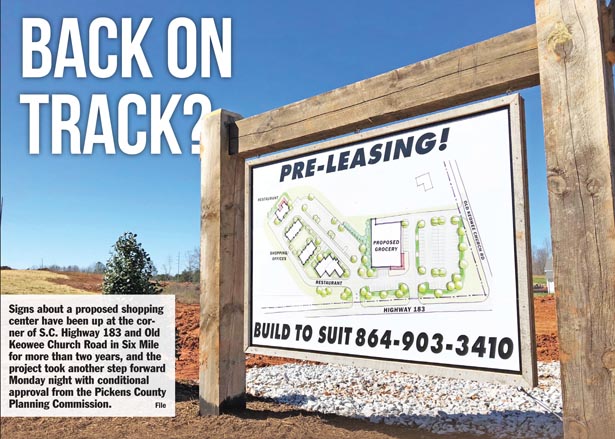 The commission approved a proposal for a new commercial center located at the intersection of S.C. Highway 183 and Old Keowee Church Road in Six Mile, as long as certain conditions are met.