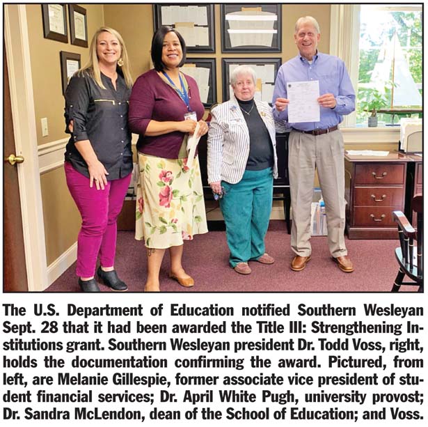 The Department of Education notified Southern Wesleyan University Sept. 28 that it had been awarded the Title III: Strengthening Institutions grant in the amount of $450,000 per year for the next five years for a total of $2.25 million.