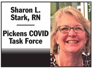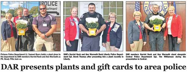 Because of COVID-19, it was impossible to present the gift card plants in person, so Nash and Warmuth delivered a gift card plant to the Central, Liberty and Pickens police departments.