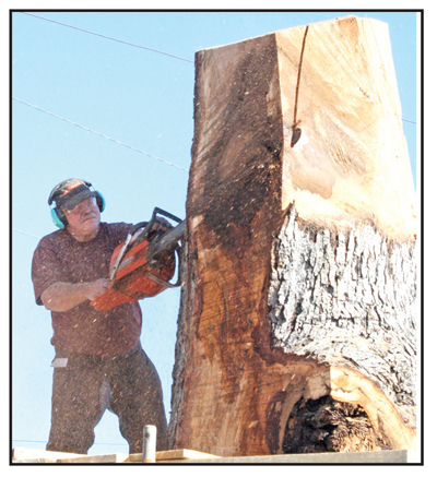 new piece of outdoor art in downtown Pickens, as Twelve Mile Defense owner David Harned hosted a four-year anniversary celebration for his business on Friday including free food and a live chainsaw carving demonstration by Rick Travers, who turned a tree outside the shop into a larger-than-life bear sculpture. It took Travers, who has been sculpting for 30 years, several days to complete the bear.