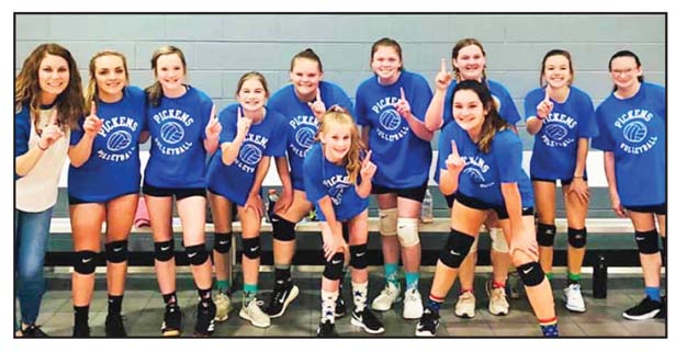 Due to statewide COVID-19 restrictions, there was no SCAP State Volleyball Tournament this year, but that didn’t stop the Western District SCAP agencies from participating. Adapting to precautionary safety protocols, three departments had teams vie for the 14U volleyball district title. Pickens started off the tournament by defeating Easley in Westminster on Nov. 7. Westminster had received the bye and was resting and waiting to see who it would face in the championship match. After losing several players to prior commitments, the Pickens team was ready and determined to prove its abilities and took the Western District championship. Coach Celia Bridges said she was elated at how well the girls gelled in such a short time. “They played like they had been together all season,” she said. Pictured are the members of the 14U volleyball all-star team. Back row, from left, are coach Celia Bridges, Hannah Hall, Lydia Hancox, Jessie Gillis, Kenslee Butler, Breeanna Adams, Emma Dowdal, Miriam Hudson and Holly Lee. In front are Hannah Kelley and Naomi Bridges.