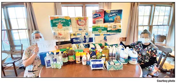 MasterCare Assisted Living employees Valarie Buchanan, left, and Lisa Gilstrap hold signs thanking the community for answering a call for help for residents and staff. MasterCare administrator Jimmy Masters said the community stepped up with an “overwhelming response” after a recent article in the Courier detailing the home’s dire need for supplies to help fight COVID-19.