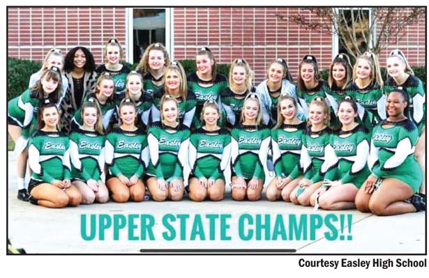 The Easley High School competitive cheerleading team is one step closer to a state championship after taking first place at the state qualifier last week. The Green Wave scored 274 points in the competition to best second-place A.C. Flora’s 267 points and third-place Catawba Ridge’s 257. The Easley cheerleading squad is led by seniors Emma Arnold, Trinitee Atkins, Jonna Harper, Carolina LeCroy, Haleigh Myhand, Bree Sewell, Erica Sheriff, Courtney Smith, Hadley West and Rileigh Williams. The Green Wave will compete for the state championship Saturday in Florence.