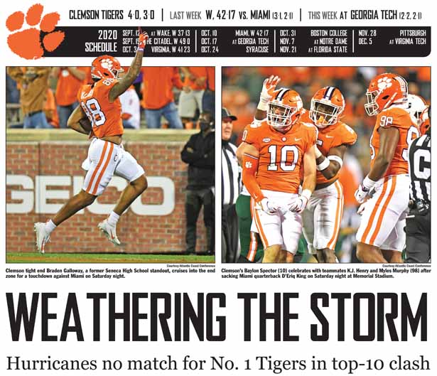 The top-ranked Tigers (4-0, 3-0) won 42-17 to remain unbeaten while holding the seventh-ranked Miami Hurricanes (3-1, 2-1) to only 210 total yards on offense in the pouring rain.