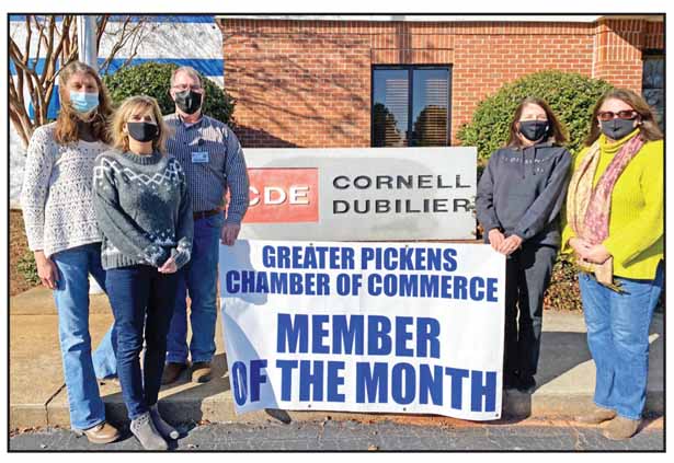 Cornell Dubilier was recently named the Greater Pickens Chamber of Comerce Member of the Month. The business is a family-owned business and is the largest North American supplier of screw-terminal, aluminum electrolytic capacitors. Cornell Dubilier’s corporate office is located in Liberty, and the company employs about 180 people locally. Cornell Dubilier has a total of four manufacturing facilities around the world. Its products are used in many different applications, from medical and energy to military and transportation. Cornell Dubilier helps power the world. You can learn more about Cornell Dubilier by vistiting cde.com. Pictured are training/HR assistant Libby Carew, chamber board member Liza Holder, Cornell Dubilier plant manager Daniel Brazinski, human resources manager Teresa Owens and chamber board member Debbie Gravely.