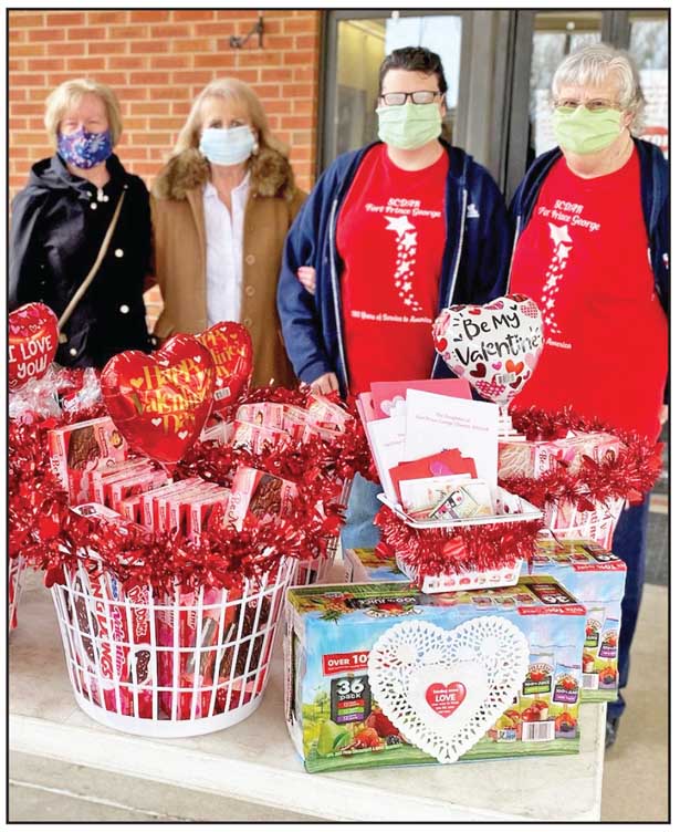 The Daughters of Fort Prince George Chapter DAR, along with several members of a local church, surprised the residents of the Richard Campbell Veterans Nursing Home with a Valentines for Veterans celebration. The gifts included an assortment of Little Debbie cakes, applesauce, pudding cups, juice boxes, room decorations, lap blankets, caps and cards. Due to COVID, they were not allowed to personally visit with the veterans residing there as they have done in the past, but had to leave the gifts at the door to be disbursed to the veterans according to the COVID protocol of the facility. If you would like to join the chapter in honoring veterans or learn more about the chapter, email fpgchapterdar@gmail.com. Pictured, from left, are Anne Kilpatrick, chapter regent Carolyn Nations, Teresa Efant and May Headley.