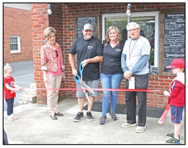 Red, White & Brew Coffee Co. on Main Street in Six Mile helds its ribbon-cutting ceremony in conjunction with the town’s annual Issaqueena Festival on Saturday. Located in old fire station at 102 S. Main St. and owned by Jen and Jarred Brink, Red, White & Brew offers a variety of coffee drinks and kolaches with the convenience of a drive-thru. The Brinks are pictured with Greater Clemson Chamber of Commerce president Susan Cohen, Six Mile Mayor Roy Stoddard and their children Emberlee and Owen holding the ribbon.