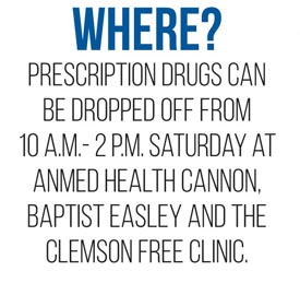 In Pickens County, pills can be dropped off at AnMed Health Cannon Hospital (123 W.G. Acker Drive, Pickens), Prisma Health Baptist Easley (200 Fleetwood Drive, Easley) and the Clemson Free Clinic (1200 Clemson Blvd., Clemson).