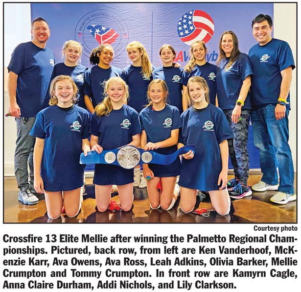LIBERTY — Earlier this month, Crossfire 13 Elite Mellie won the Palmetto Regional Championships at the Rock Hill Sports and Event Center to complete a perfect 40-0 regular season. It was the first-ever regional tournament championship at any age for the Crossfire Volleyball