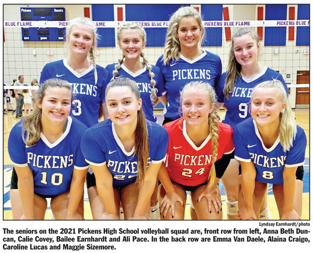 PICKENS — The Pickens High School Lady Blue Flame volleyball team, which features eight seniors, downed Class 5A powerhouse T.L. Hanna of Anderson last week in the friendly confines of Coach Peggy Harden Anthony Gymnasium on the Pickens High School campus.