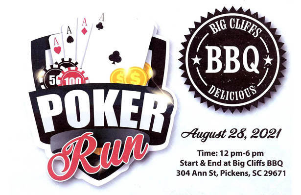 PICKENS — Get your motor running. Head out on the highway for a huge poker run at Big Cliff’s BBQ, located at 304 Ann St. in Pickens, from noon-6 p.m. this Saturday.