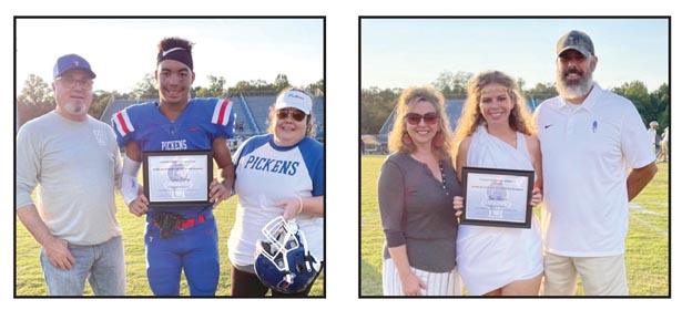 During Pickens High School’s varsity football game against Pendleton on Friday night at Bill Isaacs Field, the school announced its Scholar-Athletes of the Week for the week of Sept. 3. The winner of the male Scholar-Athlete of the Week was Tucker Perry (football), nominated by Mrs. Lisa Hiott. He is the son of Lori and David Kocher. The Female Scholar-Athlete of the Week was Jesi Turner (tennis), nominated by Dr. Ginger Hicks. She is the daughter of Bart and Mandy Turner. Scholar-Athletes are nominated by their teachers for demonstrating academic excellence in the classroom. The nominations are reviewed by a committee, and a male and female fall sports recipient will be recognized at each home game this season.