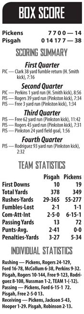 Pickens managed to drive inside Pisgah’s red zone twice in the fourth quarter, but fell short on a fourth down and then had a pass picked off in the end zone by Free. Bears junior running back Dez Rodriguez scored on a 93-yard run with 2:32 left to play, and Pisgah went on to win 38-14.