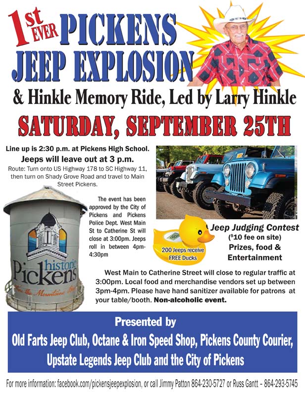 PICKENS — The Pickens area will hear the roar of Jeeps once more this Saturday as the first-ever Pickens Jeep Explosion and Hinkle Memory Ride will take place in Pickens.