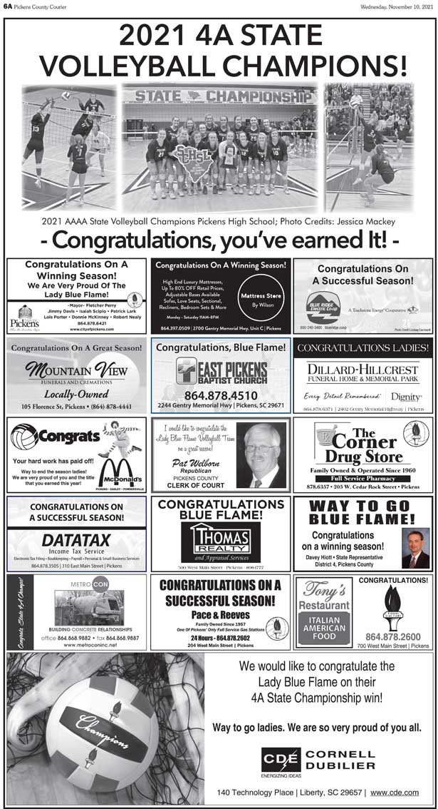 “It feels great,” Pickens senior libero Bailee Earnhardt said after the win. “This is my fifth trip, and it’s just wonderful to finally bring home a gold medal instead of a silver one.”